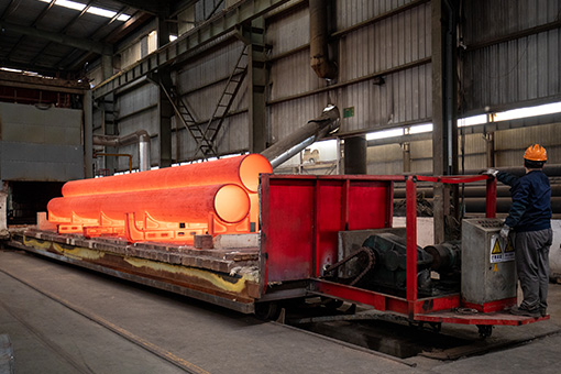 對于Φ273~Φ508無縫鋼管,采用帶坯委外加工方式,見單軋制原管,我司再自行完成熱處理、精整和后道工序;對于直徑>508mm,徑壁比>25(無法軋制)的大直徑薄壁無縫鋼管,委托天淮、誠德等企業穿孔定徑后,我司采用中頻熱擴工藝擴制,結合冷拔、熱處理、精整等能力最終完成成品。